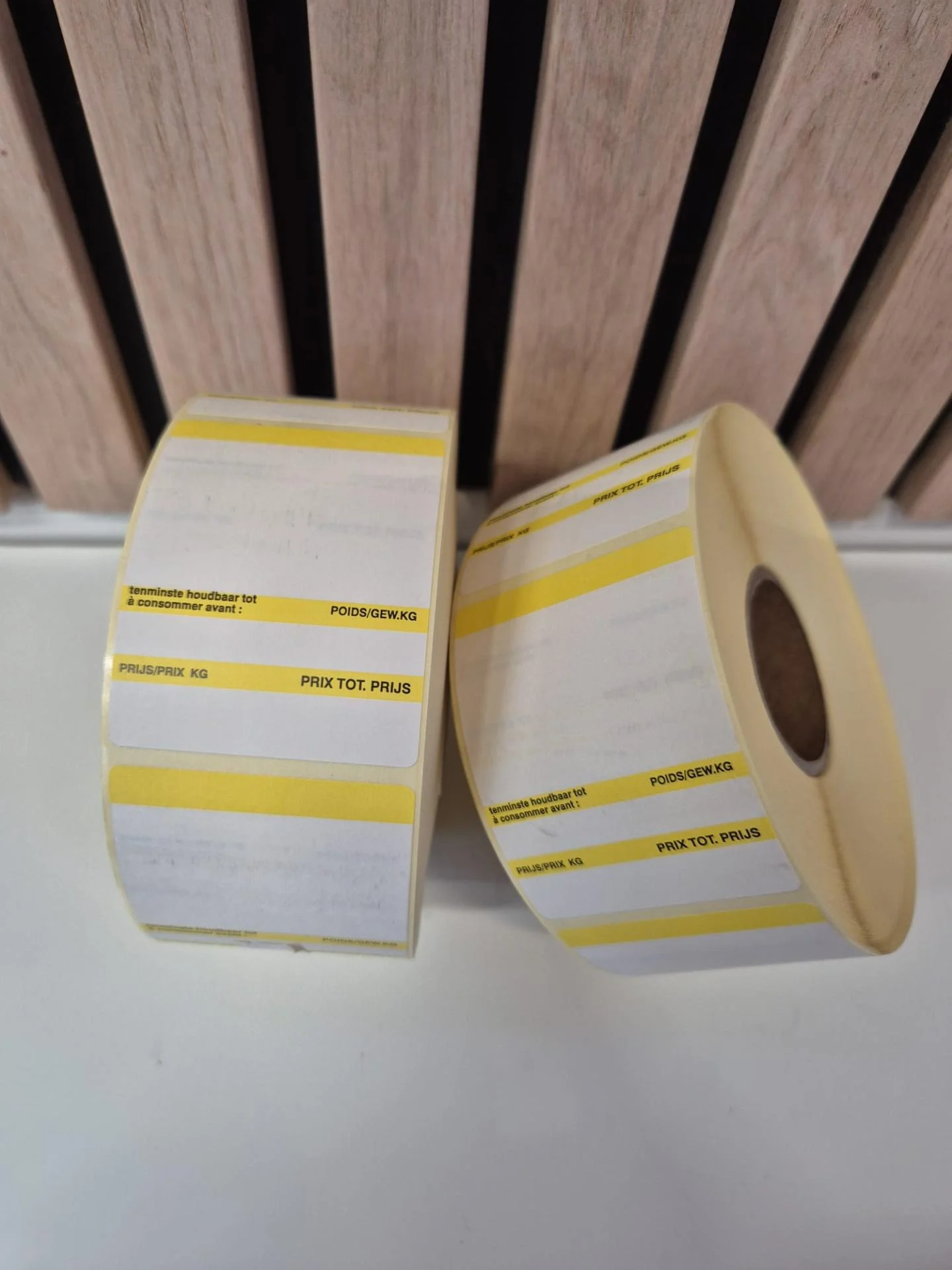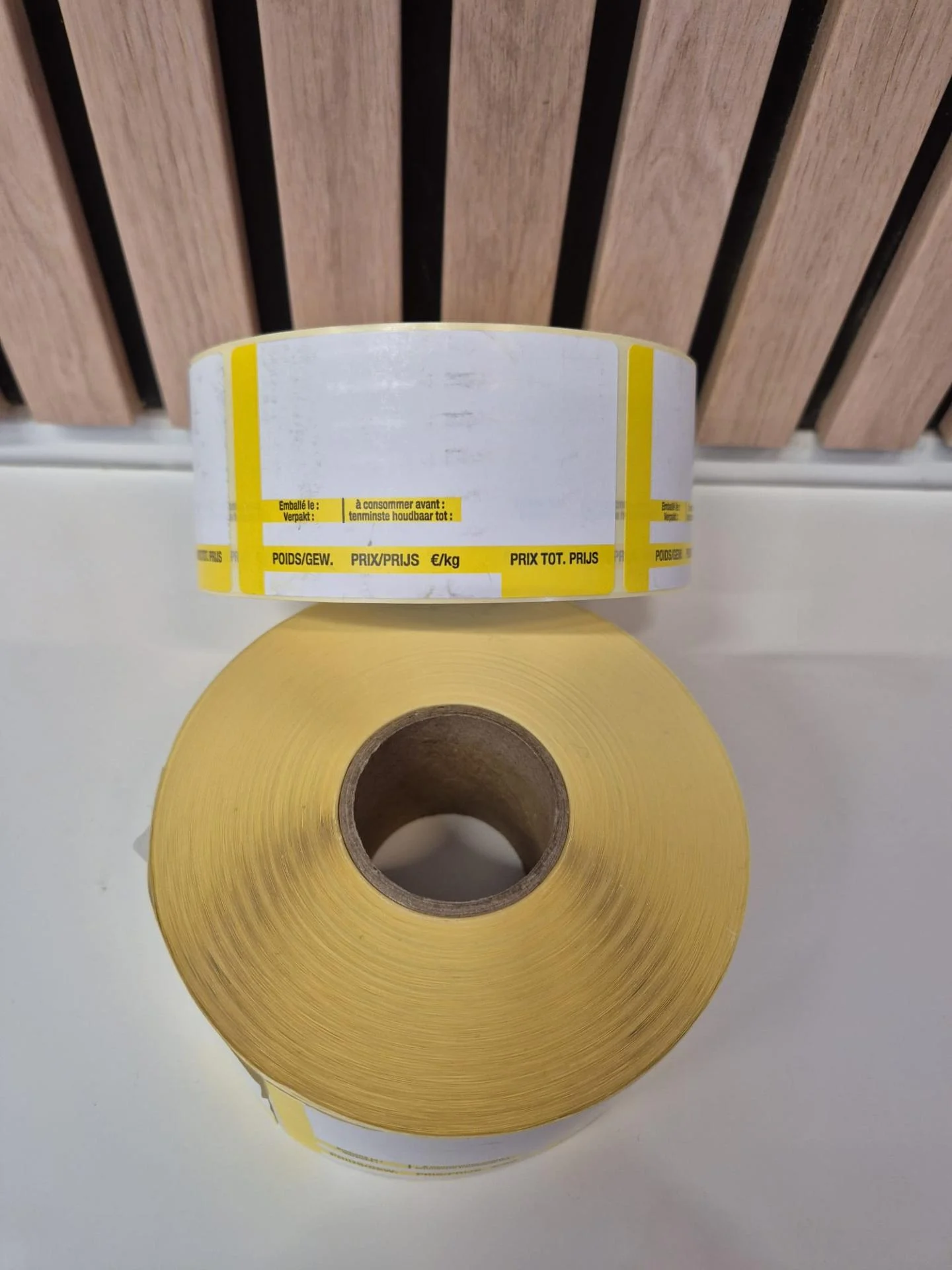 Rouleaux d'étiquettes jaunes pré-imprimées pour balances. Vendu par carton de 6 pcs